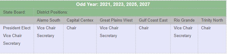 2025 Nominating Committee Kim Broussard, OTR, OTD, PhD (Trinity North) - Committee Chair Amber B. Armstead, DrPH, OTR/L, BCPR (Gulf Coast East) Elizabeth Deluca-Berg, OTR, OTD, CAPS (Capital Centex) Tiffany Green, COTA, M.Ed. (Gulf Coast East) Ricky Joseph, Ph.D., MA-HRM, OTR, FAOTA (Alamo South) Donna Walls, OTR, OTD, CHT (Great Plains West)