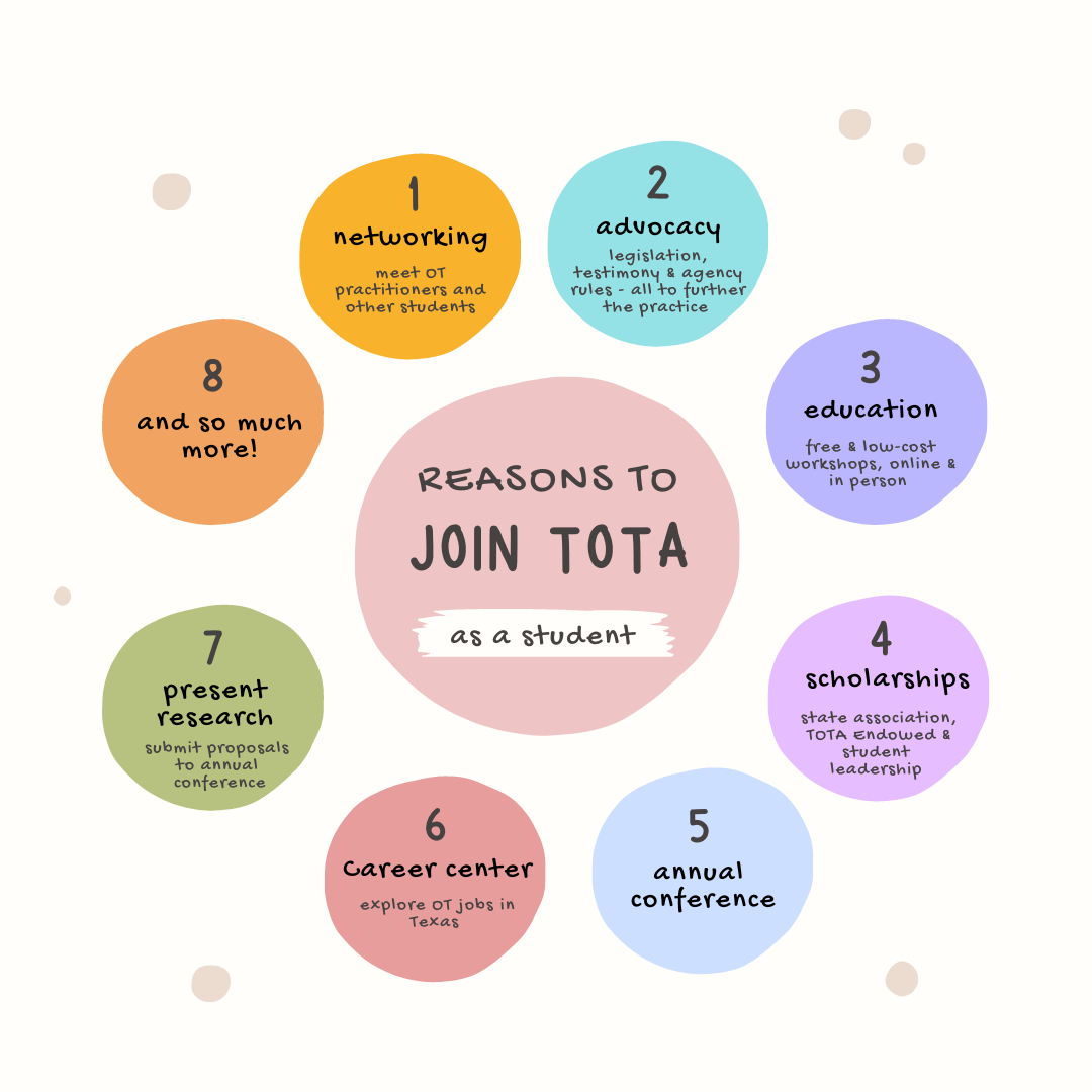 Social Media Share - Why become a student member Student Organization Groups - Connect with other student organizations through social media. Education and Learning Opportunities Available in the TOTA LMS (most courses are free for TOTA members) Professional Development Activities and Opportunities